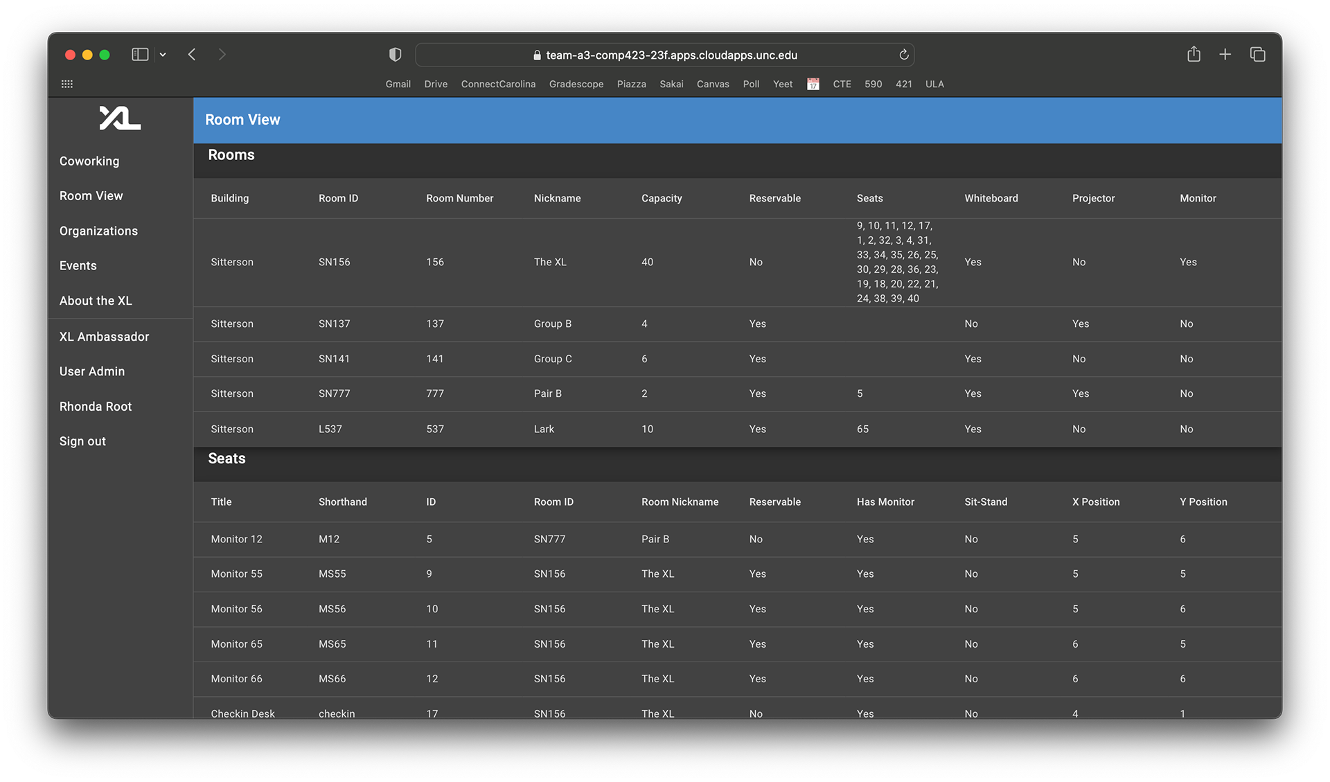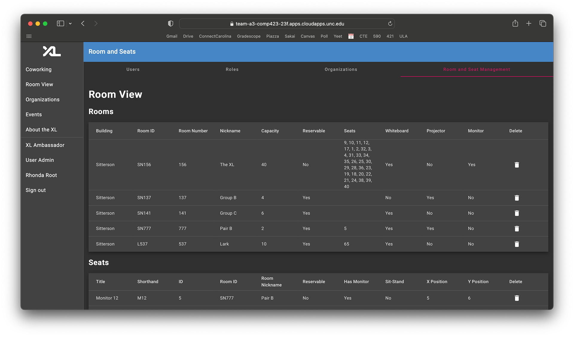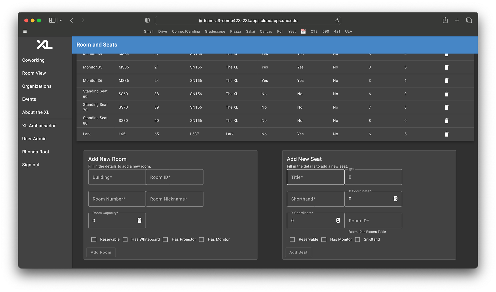 rooms and seats in tabular format for admin of the CSXL, while incorporating functionalities